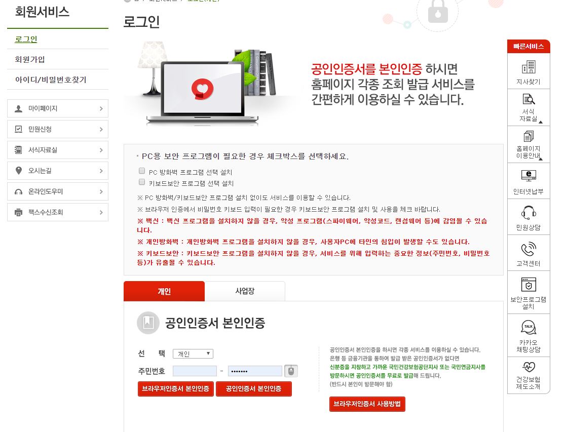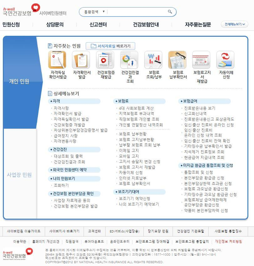 국민건강보험 사이버민원센터의 홈페이지 입니다.