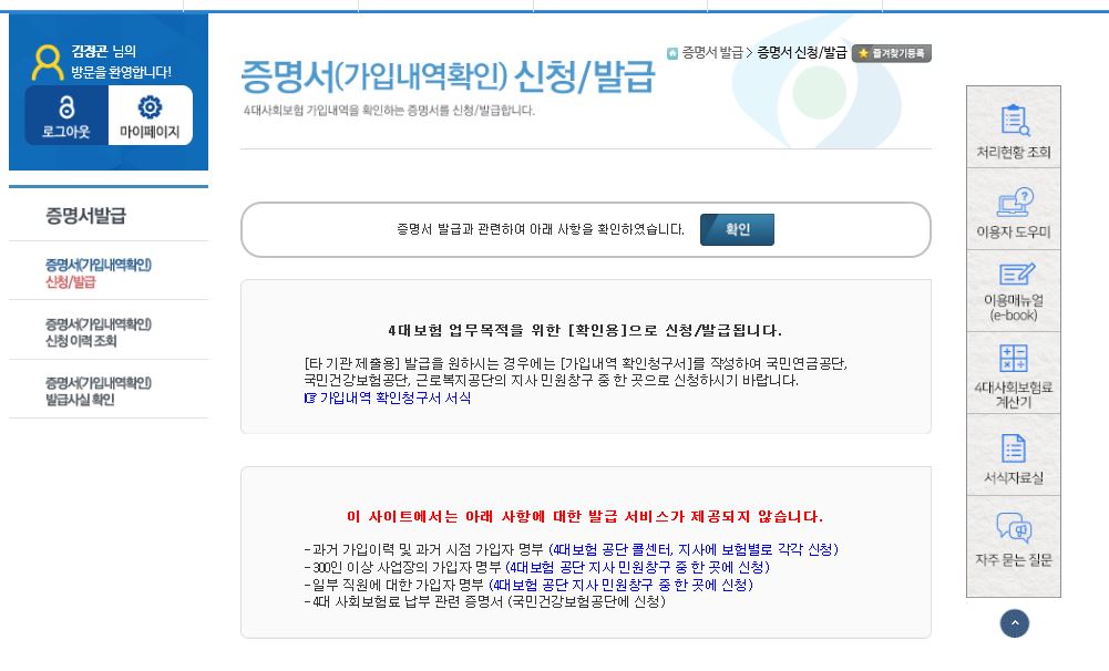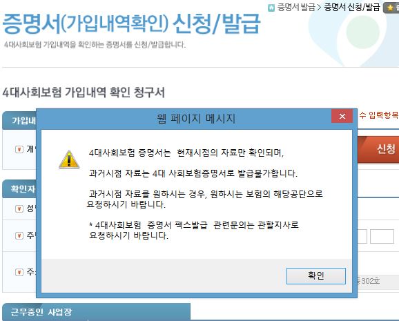이곳에서 발급하는 4대보험가입증명서(4대보험 증명서)는 현재 시점의 자료만 확인됩니다.