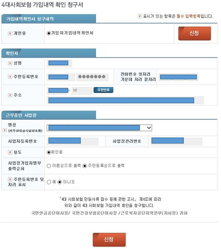 즉, 4대사회보험 가입내역 확인 청구서를 작성할 수 있는 코너가 나옵니다.